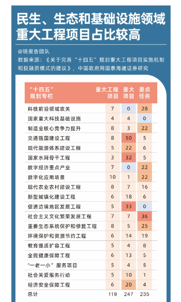 而從“十三五”到“十四五”的趨勢來看,“兩重”項目中民生、生態和基礎設施領域項目占比較高,未來的“十五五”或將延續這種趨勢——這也是“集中力量辦大事”的生動體現。