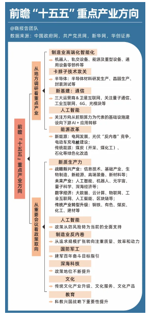 由于過去的五年計劃編纂,往往會通過高層地方調研以及召開座談會聽取意見,因此可以從兩個方面來推測“十五五”規劃中可能出現的科技主線行業。