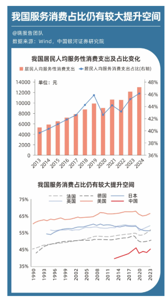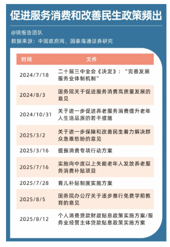 此外,就是大力發展服務型消費。最近兩年,國家層面,密集出臺了多項服務消費刺激政策。如202483日,國務院出臺《促進服務消費高質量發展的意見》,2025316日推出《提振消費專項行動方案》、728日的《育兒補貼制度實施方案》等。