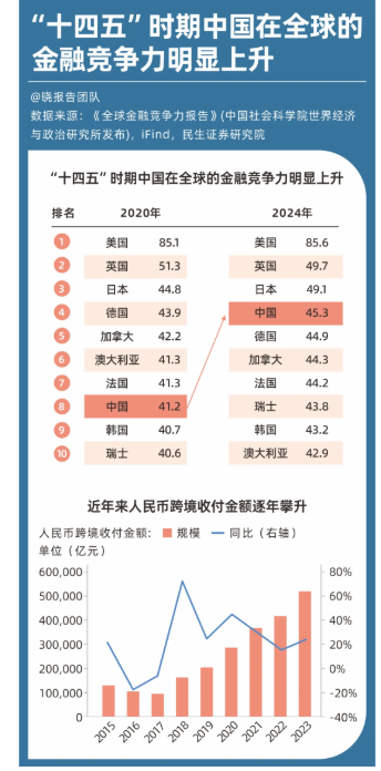 而在“十四五”期間,中國金融競爭力排名明顯提升。根據《全球金融競爭力報告》,中國金融競爭力從2020年的41.2增長至2024年的45.3。排名從全球第八上升至全球第四位。