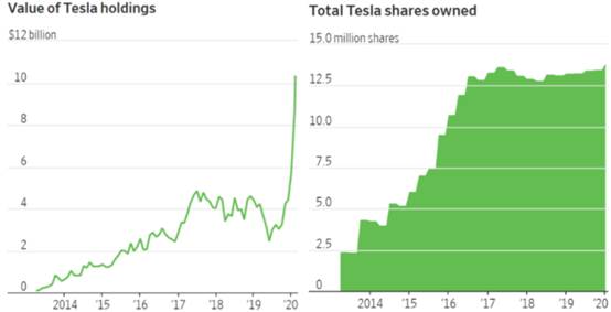 Baillie Gifford在2013年初耗資8900萬美元建立了230萬股的特斯拉頭寸,平均持股成本僅為38.7美元;而在隨后三年,Baillie Gifford繼續(xù)在二級市場買買買,在2017年持有了約1400萬股的特斯拉股票,從此穩(wěn)居特斯拉二股東席位。