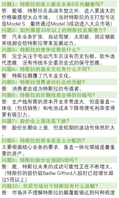 在這個早年完成的特斯拉投資介紹頁中,Baillie Gifford還進(jìn)行了一系列蘇格拉底式的思辯問答(下圖)。
