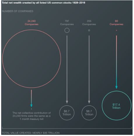 以美國股市為例,從1926年到2016年間美國股市合計(jì)有25332家公司先后上市,創(chuàng)造了接近35萬億美元的巨額財(cái)富。然而,其中2.4萬家上市公司的合計(jì)財(cái)富創(chuàng)造幾乎為零,而最卓越的90家公司(占比千分之三)創(chuàng)造了接近一半的財(cái)富。