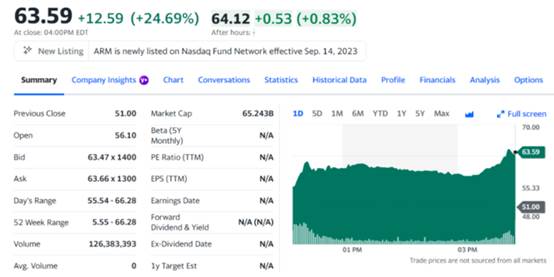 截至收盤,ARM股價上漲24.69%,報63.59美元,以此計算,市值為652.48億美元(約4745億元),若包括限制性股票單位在內,Arm完全攤薄后的估值接近680億美元。