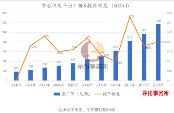 10月31日深夜,貴州茅臺發布公告稱將53%vol 貴州茅臺酒(飛天、五星)的出廠價格上調約 20%,市場指導價則沒有變動。知情人士告訴茅粉事務所,最新的出廠價為1169元。這與20%的提價幅度相當。