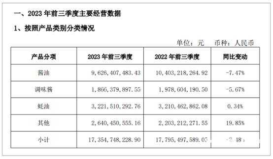 從營收來源看,目前海天味業(yè)主要仰仗醬油、調(diào)味醬、蠔油三大業(yè)務(wù),這三項(xiàng)占總營收超80%,被稱為海天味業(yè)的“三駕馬車”。但在最新財(cái)報(bào)中,這“三駕馬車”都不太給力。今年前三季度——