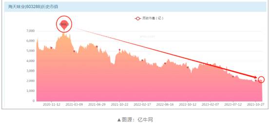 但時(shí)至今日,這個(gè)神話已然熄火。截至2023年11月22日收盤,海天味業(yè)的總市值只剩下2113億,相比高點(diǎn)跌去近70%。