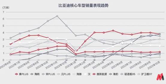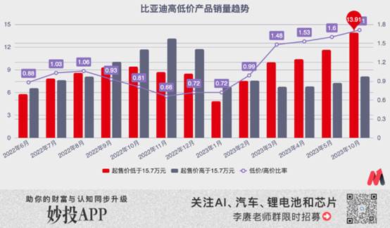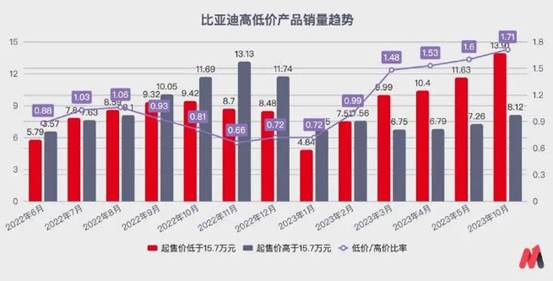 通過兩撥產品的具體銷量變化以及兩者的比率變化,可以非常明顯地看出,比亞迪從去年年中的“高低端齊頭并進”,轉化為2022年底的“沖擊高端”,最終在2023年全面倒向“低端支撐”的過程。