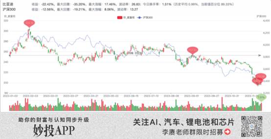 在下半年股價走低的進程中,下跌最快最狠的卻是11月下旬,造成下跌的源頭并不是車企,而是華為進一步加深與其他自主車企合作。目前比亞迪仍未恢復事件前的股價水平,市值水平更是直接回到了2020年末的水平。