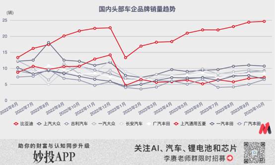 與這樣糟糕表現對應的,是比亞迪在中國整體汽車市場繼續“高奏凱歌”。從去年9月開始,就牢牢鎖定了國內乘用車品牌銷量第一的位置。在進入2023年之后,基本上都能做到兩倍于第二名的上汽大眾。
