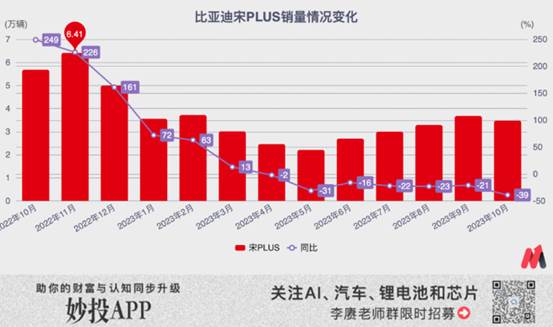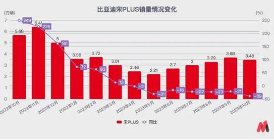 我們以比亞迪2021年發布的、在15-20萬元區間的緊湊級SUV拳頭產品“宋PLUS”為例,它曾在2022年一口氣賣出了36.5萬輛,在2022年末甚至保持了超過200%的同比增長。但在進入2023年之后,銷量快速下滑,從5月開始大幅同比下滑。