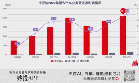 銷量的大漲也帶來了財務表現上的提升。在刨除消費電子代工業務(比亞迪電子)的情況下,比亞迪汽車業務在今年前三季度實現了3301億元收入,以及183億元的凈利潤收入。其中凈利潤表現最好的第三季度,總營收1261.9億元人民幣,凈利潤更是達到88.9億元,一舉讓比亞迪汽車業務單季度的凈利潤率飆漲到7%。