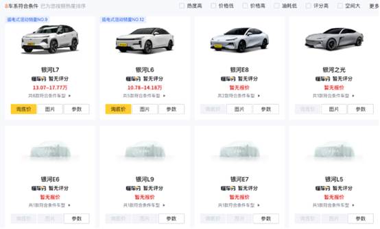 以吉利銀河為例,除了概念車“銀河之光”之外,目前上市的三款產品定位上均有相似的比亞迪產品:銀河L6對應秦PLUS;銀河L7對應宋Pro/PLUS;即將上市的銀河E8對應比亞迪漢。