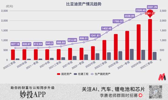 規模上漲的威力之大,解決比亞迪“自產自銷”架構缺點之有效,讓其在過去3年在“擴規模”這件事上“異常激進”。根據官方公布的財務數字,比亞迪光是“固定資產+在建工程”,就從2021年的815億元,漲到了2023年的2490億元。