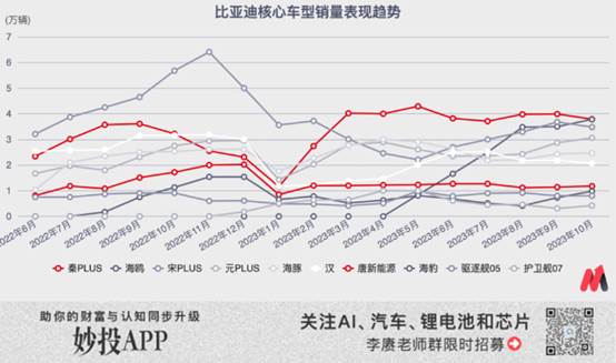 將比亞迪的主力市售車型按照15.7萬元這個關鍵節點,分成兩撥:低于15.7萬元的典型車型包括秦PLUS、海鷗、海豚、元PLUS、驅逐艦05;高于15.7萬元的車型包括宋PLUS(起售價略低于15.7萬元,但平均售價高于)、海豹、漢、唐、護衛艦07。