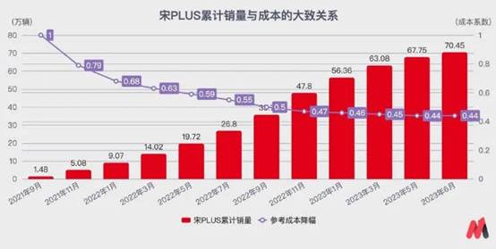 以我們上文重點分析的宋PLUS為例,參考汽車行業的經驗總結,其在2023年6月換代之前,累計銷售出70.45萬輛,假如將第一個月的生產成本定為1單位,那么到2023年6月的生產成本大概會下降到0.44單位成本左右,70.45萬輛的總體成本能夠下降到0.55單位成本左右。