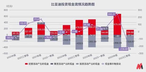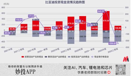 而在現金流視角中,2021年中至今,比亞迪兩年半總計3040億元的經營現金流最終用來還上了236億元債務,以及高達2556億元的新投資。相當于每次一賺了錢,只留下了極少部分更大銷量需要的周轉現金流之后,直接把錢丟去買新廠房和新設備了。