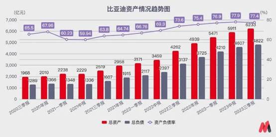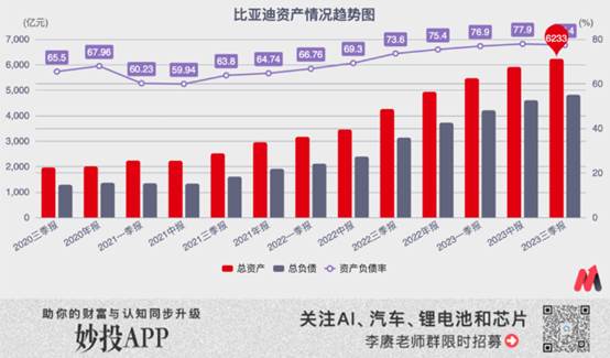為了在短短的2年里實現規模的快速擴張,目前比亞迪整體的負債率已經從2021年底的64.74%,進一步上漲到了2023年三季度的77.37%。整體負債從1607億元,狂飆至4822億元。