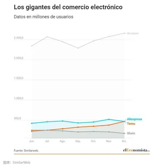 時間往前倒6個月,當時的Temu全球用戶規模僅為2.263億,排名第四。前三依次是亞馬遜(23.45億)、Aliexpress(4.218億用戶)和Shein(2.513億用戶)。