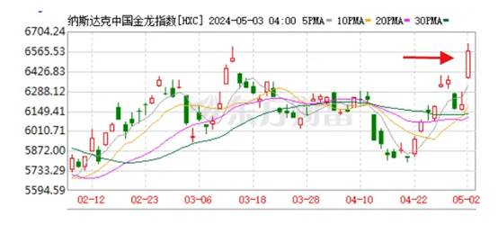 納斯達克中國金龍指數(上圖)漲超6%,創去年11月底以來收盤新高,并創下去年7月底以來最大單日漲幅。