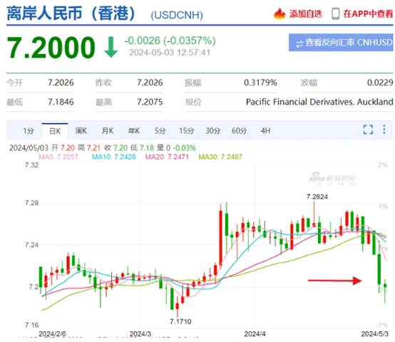 最近,在岸價暫時定格在了7.24元人民幣兌換1美元(4月30日價格),而離岸價一度升值到了7.18左右兌換1美元,兩者出現了顯著的差異。