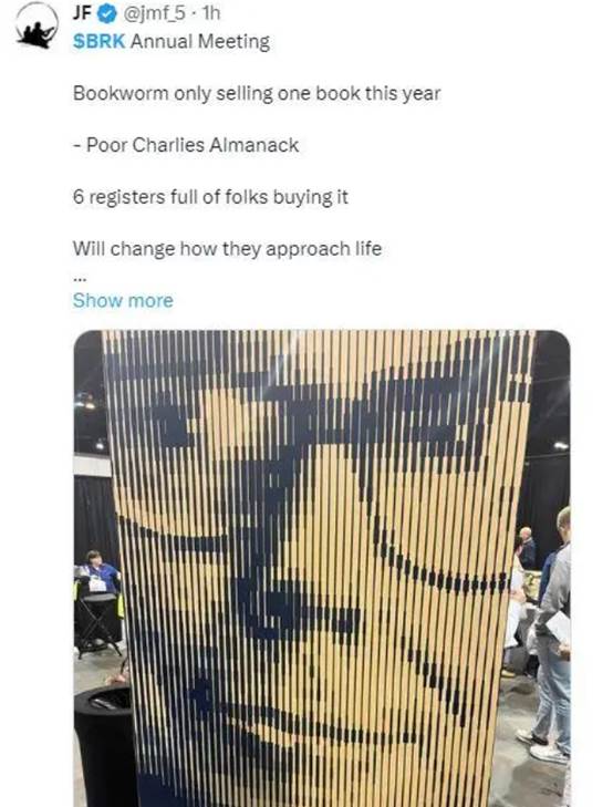 他還推薦大家都去買《窮查理寶典》。有參會人士提到,每一條賣書結賬通道都排滿了人。