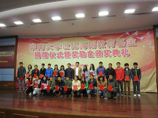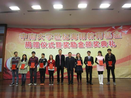 2008年初,在成立兩周年之際,世紀海翔投資集團在中南大學設立了“世紀海翔酬勤教育獎勵金”。設立七年來,已有906名品學兼優的大學生獲得了海翔的獎勵和資助。未來世紀海翔投資集團將一如既往地獎勵和資助廣大師生,并不斷豐富海翔集團在中南大學的獎學助學計劃,以期讓世紀海翔的正能量更大范圍地傳遞給更多需要幫助和應該獎勵的廣大師生。