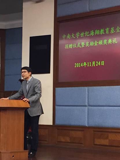 在隨后舉行的2014年度世紀海翔酬勤獎(助)學金頒獎典禮上,2014年度世紀海翔酬勤獎學金獲得者胡海洋同學代表獲獎學生發言,引用世紀海翔集團董事長顧京先生在集團成立之初的致辭作為開篇,感謝世紀海翔酬勤獎學金給學子們帶來的表彰和鼓勵。在發言中胡同學講道“在這寄托了個人情懷與企業家胸懷的獎(助)學金里,更多的是對晚輩的關懷與鼓勵,對社會未來充滿信心與憧憬和海翔精神在中南大學的傳承”。他代表所有獲得獎(助)學金鼓勵與資助的學生,感謝世紀海翔酬勤獎(助)學金的錦上添花和雪中送炭。“這不光是一份對優秀學子過往成績的肯定,猶如錦上添花一般讓獲獎同學更受鼓舞和激勵;更是對廣大寒門學子的有力資助,正如雪中送炭一般讓眾多家境貧寒的同學在艱難求學路上得到了極大支持和溫暖”。最后,胡同學引用毛主席的詞:“鷹擊長空,魚翔淺底,萬類霜天競自由”,表達了自己自強不息、待成棟梁之時,上九天攬月,與四海翱翔的遠大抱負。