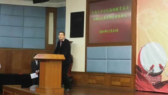 世紀海翔投資集團股東代表潘立輝先生隨后發表了講話。他表示,作為世紀海翔的一員,對于世紀海翔董事長顧京先生發起的中南大學獎助學計劃非常贊賞,并愿意傾力配合;希望獲得獎學金的同學將來能夠傳承世紀海翔“積極向上、持久創新”的精神,力所能及地給師弟師妹們提供幫助,并囑咐廣大學子要樹立正確的人生觀、價值觀和道德觀。最后,潘立輝先生引用馬云的一句話“夢想還是要有的,萬一實現了呢”作為對中南學子們的勸勉與鼓勵。
