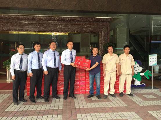 國慶、中秋雙節將至,海翔集團行政部經理陳燕平先生代表集團,給鼎豐大廈、海翔廣場、聯合廣場的物業員工送去了節日的慰問。祝物業工作人員節日快樂,合家安康,團團圓圓,并對節假日中仍堅守在工作崗位上的物業員工表示感謝。